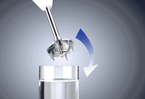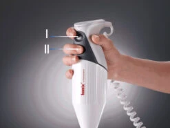 Je gebruikt deze staafmixer kort voor harde ingrediënten en langer achter elkaar voor zachte ingrediënten.