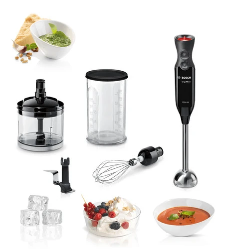 Bij de Bosch ErgoMixx MS61B6170 zit een ballongarde, zodat je gemakkelijk slagroom en eiwitten opklopt. In de hakmolen hak je ingrediënten fijn, zoals noten of ui. Dankzij het krachtige vermogen gebruik je de staafmixer voor meerdere bereidingen achter elkaar. Hak bijvoorbeeld eerst alle ingrediënten fijn in de hakmolen en mix ze na het koken tot een egale soep. Met de 12 standen stel je de snelheid nauwkeurig in. Zet ‘m bijvoorbeeld hoog wanneer je soep pureert en laag als je een wat grovere bereiding maakt, zoals pesto.