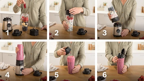 Je gebruikt de blendbeker om in te mixen, uit te drinken en om mee te nemen voor onderweg.
