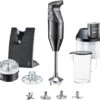 Met de Braun MultiQuick 9 MQ9187XLI Zwart haal je een staafmixer en foodprocessor met een volledige set accessoires in huis. Dankzij het vermogen van 1.200 watt pureert en mixt de staafmixer zonder moeite harde ingrediënten. De op-en-neer bewegende staafmixervoet helpt om hierbij zelfs de hardste stukjes glad te pureren. Het anti-spat design zorgt ervoor dat jouw keuken tijdens het mixen schoon blijft. Voor grote hoeveelheden gebruik je de XL foodprocessor, waarmee je met de verschillende snijmessen bijvoorbeeld wortels julienne raspt, aardappels tot friet snijdt of deeg kneedt. In de kleinere hakmolen maal je ijs fijn voor je smoothie, of maak je een lekkere pesto. Je reinigt de staafmixer en accessoires na gebruik eenvoudig in de vaatwasser.