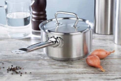 Met de Demeyere Pannenset Classic 4-delig haal je een mooie startset in huis. De set bestaat uit 3 kookpannen, 3 deksels en een steelpan. De pannen hebben een 3-laagse bodem met een tussenlaag van zuiver aluminium voor een goede warmtegeleiding en -verdeling. Dankzij de isolerende wanden kook je gecontroleerd op lage temperaturen en bespaar je energie. Bovendien hebben de pannen een speciaal gevormde rand, zodat je aardappels en groenten gemakkelijk en zonder morsen afgiet. Ook aan hygiëne is gedacht. De handvatten van de pannen zijn gelast, zodat vuil en vet geen kans krijgen om zich te nestelen. Je gebruikt de pannen op iedere warmtebron, inclusief inductie en in de oven tot aan 280 °C. Na gebruik reinig je de pannen eenvoudig in de vaatwasmachine.