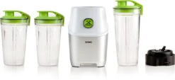 Met deze krachtige DOMO DO700BL X-power blender van 1.000 watt maak je in een handomdraai een lekkere smoothie. Vul de grote of 1 van de 2 kleine blenderkannen met je favoriete ingrediënten, draai het mes erop en zet ‘m op de blender. Je houdt de knop net zo lang ingedrukt tot jouw drankje de gewenste dikte heeft. Gebruik je wat hardere stukken groenten of fruit? Laat de knop dan tussendoor even los om te pulseren. Zo geef je de ingrediënten de tijd om terug naar het mes te zakken voordat je de blender weer laat draaien en weet je zeker dat je een gladde smoothie serveert. Ben je klaar? Vervang het mes dan voor een drinkdeksel en neem je smoothie meteen mee op pad. Haal je je trein nog nét.