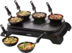 Met de DOMO DO8710W gourmetstel haal je een set in huis waarmee je met een gezin van 6 personen van aan tafel gewokte maaltijden geniet. De kleine pannen zijn door de antiaanbaklaag gemakkelijk schoon te krijgen. Met 1000 watt aan vermogen wordt het onderstel snel heet, waardoor je dus niet lang te wacht voor je bakt. Geen zin om te wokken, maar trek in ouderwetse Hollandse pannenkoeken? Je verwijdert simpelweg alleen de pannetjes en bakt de pannenkoekjes in de handig geïntergreerde bakplaten. Een meegeleverde pollepel maakt het bakken makkelijk.