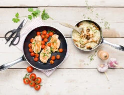De bakpan is geschikt voor alle warmtebronnen, inclusief inductie en gebruik in de oven tot aan 280 graden Celsius.