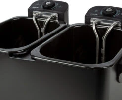 Met de 2 pannen bereid je gemakkelijk frietjes en snacks tegelijk.