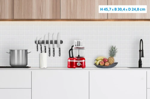 Deze KitchenAid Artisan Foodprocessor Keizerrood van gegoten metaal is robuust, stabiel en duurzaam. Je ontvangt de processor met mengkommen van 4 liter, 2,4 liter en 1 liter die in elkaar passen. De 3-delige toevoerbuis zorgt ervoor dat je aardappelen, courgettes en wortels in z’n geheel snijdt en de snijschijf verstel je gemakkelijk, waardoor je tussen de 1 en 6 millimeter dikte snijdt. Met de blokjeskit maak je snel blokjes groenten, fruit of kaas. Raspen wordt een fluitje van een cent door de omkeerbare raspschijf voor fijne en grove stukken en de raspschijf voor harde kazen, ijs of chocolade. Met de frietenschijf maak je in een handomdraai zelfgemaakte frieten. Tot de standaard accessoires behoren tevens een citruspers en een eierklopper. Geen zorgen over de opbergmogelijkheden, je ontvangt een opbergbox voor alle accessoires.