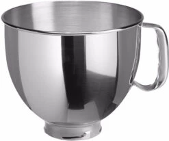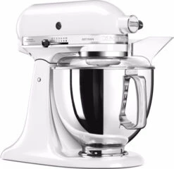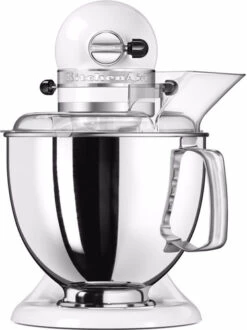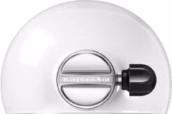 Met de KitchenAid Artisan Mixer 5KSM175PSEWH Wit maak jij met weinig inspanning deeg en beslag. Deze krachtige keukenmixer heeft een vermogen van 300 watt, maar de motor bevindt zich in de kop. Hierdoor kan hij met gemak zwaar brooddeeg aan, want er gaat geen energie verloren tussen de menghaak en de motor. De kop van de KitchenAid is kantelbaar, hierdoor verwissel je de deeghaken eenvoudig. Doordat er 2 mengkommen worden meegeleverd hoef je tussendoor niet af te wassen en het schenkschild voorkomt een aanrecht vol beslagspetters. Wil je de mogelijkheden van je KitchenAid Artisan verder uitbreiden? Er is een groot assortiment opzetstukken verkrijgbaar. Deze bevestig je op het aansluitpunt aan de voorzijde.