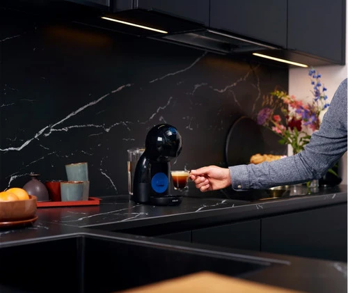 De Dolce Gusto Piccolo XS KP1A08 Zwart is met slechts 14 centimeter breed een smalle koffiemachine die weinig plek inneemt op het keukenblok. Het gebruik van de Dolce Gusto is erg simpel. Verwijder de capsulehouder en de machine gaat automatisch aan. Binnen 40 seconden is het koffiezetapparaat opgewarmd en klaar voor gebruik. Plaats een capsule voor een koffie-, theespecialiteit of voor een chocolademelk in de capsulehouder en haal de hendel over om een warme drank te bereiden. Beweeg je de hendel naar de koude stand? Dan zet je in een handomdraai een ijskoffie of ijsthee. Plaats de hendel wel weer terug naar de beginpositie, want de koffiemachine stopt niet automatisch met de bereiding. Na één minuut schakelt de machine zichzelf automatisch uit, dankzij de energiebesparende stand.