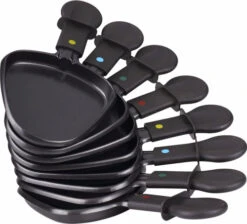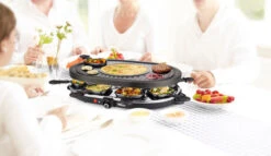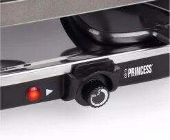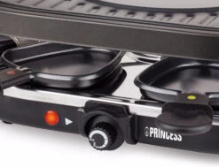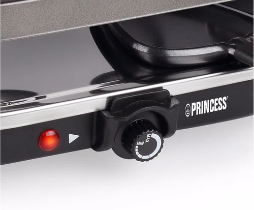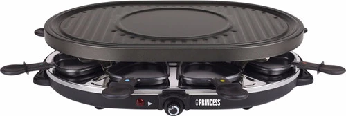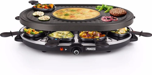 De Princess Raclette 8 Oval Grill Party 162700 is een unieke combinatie tussen een gourmetstel, raclette en crêpemaker. Ga met 8 personen aan de slag met vlees en vis op de grillplaat en bak tegelijkertijd uitjes in een pannetje en sluit de avond af met heerlijke pannenkoeken. Op de bakplaat zit een speciaal crêpegedeelte, voor de echte zoetekauwen aan tafel. De ovale vorm maakt het mogelijk om met zijn allen gemakkelijk bij het gourmetstel te komen. Je stelt voor elk gerecht de juiste temperatuur in dankzij de geïntegreerde thermostaat. Door de antiaanbaklaag op de grillplaat en in de pannetjes heb je minder boter en olie nodig. Plaats na gebruik de pannetjes in de vaatwasser en maak de grillplaat schoon met een stukje keukenpapier.