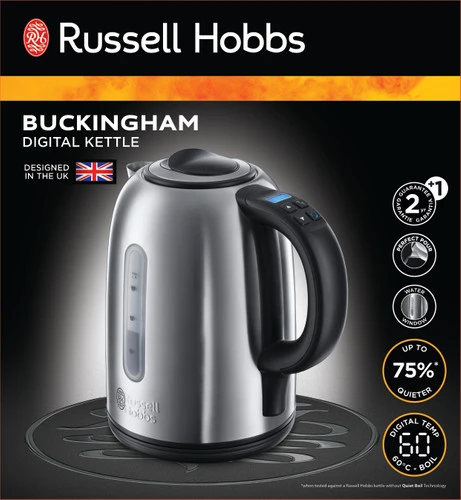 De Russell Hobbs Buckingham Digital 1040-70 is een extra stille waterkoker met een inhoud van 1,7 liter. Het apparaat is erg geschikt voor de echte theeliefhebber. Je kiest met deze waterkoker namelijk de juiste temperatuur voor jouw kopje thee. Daarbij kies je een temperatuur uit tussen de 60 tot 100 graden Celsius. De waterkoker maakt zo’n 75 procent minder geluid dan vergelijkbare waterkokers zonder de Quiet Boil-technologie. Gebruik je de volledige capaciteit van de waterkoker, dan maak je 7 koppen thee. De schenktuit zorgt dat je het gekookte water gemakkelijk uitschenkt zonder te knoeien.