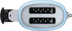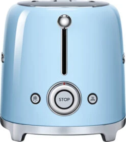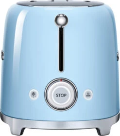 Met de SMEG TSF01PBEU Lichtblauw broodrooster zijn je sneetjes brood in mum van tijd geroosterd. Het broodrooster heeft namelijk een hoog vermogen van 950 watt. Je kiest uit 6 verschillende standen. Zo maak je het brood zo krokant als jij wilt. Hij heeft 3 automatische programma’s waarmee je verwarmt, ontdooit of éénzijdig roostert. De laatste functie komt goed van pas wanneer je een bagel wilt maken. Het brood plaats je in de sleuven en duw je met de hendel omlaag. Wanneer de sneetjes krokant genoeg zijn, worden ze automatisch omhoog geduwd. Na gebruik maak je de kruimellade gemakkelijk schoon. De stekker berg je aan de achterkant netjes op.