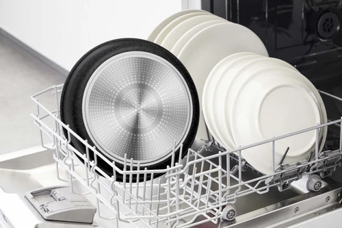 Je neemt de kunststof handgrepen af voordat je de pannen in de oven zet, zodat ze niet smelten.